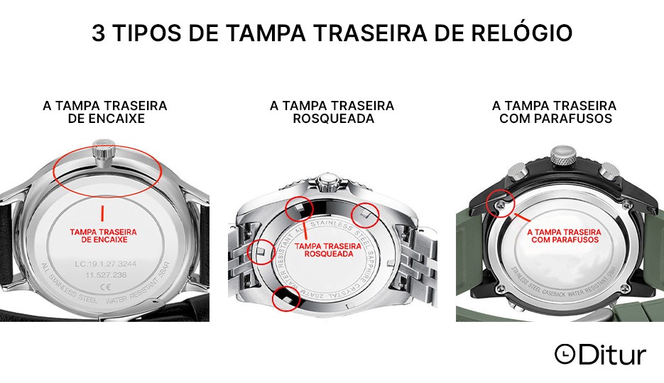 Para conseguir substituir a bateria de um relógio, é necessário ter algumas ferramentas. O tipo de ferramenta depende do tipo de tampa traseira que o seu relógio possui. Aqui estão os três tipos mais comuns de tampas de relógio: